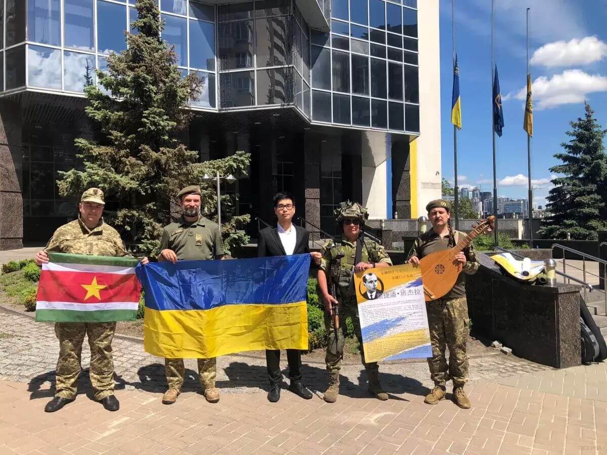 Зліва направо: волонтер і просвітник Соколов Сергій; Капелан; представник Республіки Суринам, що підтримала Україну в ООН у війні проти московії, справжній бандерівець пан Джейсон Хок Мен Чой; відданний справі Панцер; найвідоміший кобзар і бандурист сучасності Тарас Компаніченко. В руках прапори Республіки Суринам та України; плакат з цитатами Степана Бандери мові Суринаму; українська бандура. Фотографує дипломат і суспільний діяч Юрій Косенко.