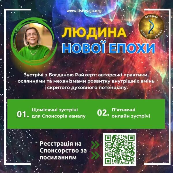 З початку повномасштабного вторгнення московитів Богдана Райхерт почала на каналі ЛМГО «ЛІСТВИЦЯ» ділитися з усіма своїми особистими моделями побудови України Майбутнього. Вона їх взяла з досвіду її служіння людям як президент ЛМГО. І коли кілька сотень тисяч людей пропрацювали ті моделі, виник запит від «тих, хто не в темі» розказати «все з самого початку» про суть механізму трансформації людини в духовну сутність. Тому з початку 2024 року я запрошуватиму на свій канал двічі на місяць пані Богдану і працюватиму у формі коротких ефірів. «Щоб не спамити», зроблю це лише для зацікавлених. Ось кілька її слів про «спеціалізацію»: