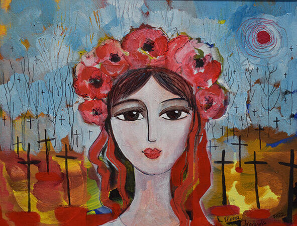 Треба сказати, що за роки АТО, й особливо за останні два роки, коли триває війна, під пензлем художниці народилися картини тематичного українського спрямування – «Біженка з Донбасу», «Місто у вогні», «Постріли серед ночі», «Маріуполь», «Ізюм», «Українська Мадонна». Так, вони також виконані у стилі фігуративної абстракції, однак їхній зміст і сенс відчуваєш серцем. І закривавлені сльози розбомбленого міста, і червоні стрічки у віночку дівчини, які нагадують струмочки крові, і абстраговані хрести, які до горизонту вкривають землю і за лінією горизонту злітають у небо, вслід за душами загиблих, – хто, як не українці, добре розуміють, що це все означає. До слова, усі згадані картини уже викуплені поціновувачами мистецтва до своїх приватних колекцій.