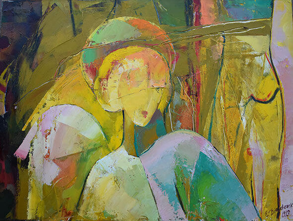 Як, наприклад, полотно «Сумний ангел». Він тут і справді є – ангел. Не зовсім такий, яким ми собі уявляємо його за не раз побаченими зображеннями на картинах релігійного змісту. Але ж ми, нагадаю, маємо справу з абстракцією. І суть картини не тільки у зображенні ангела. Поруч із ним – людина, повернута до ангела… сідницями: чи ж то не про багатьох із нас, хто повертається до зробленого добра спиною, хто забуває про подаровану любов і турботу, хто не вміє (чи не хоче) бути вдячним за щось хороше, що для тебе зробили інші?! От і сумує ангел…