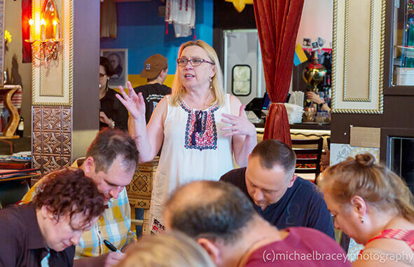 Запитаєте: а до чого тут майстер-класи? Все просто. Від їхнього проведення пані Олена має потрійне задоволення: від того, що може поділитися багатством своєї душі і таланту; від того, що бачить радість в очах «учнів», яким вдається власноруч намалювати картину; ну і від зібраних грошей – тригодинне заняття коштує 60 доларів. До речі, наступний майстер-клас відбудеться 7 серпня з 6 до 9 години вечора за адресою 327 Waukegan Ave, Highwood. Якщо маєте бажання долучитися, то надсилайте повідомлення пані Олені за телефоном 773-719-7403 або ж на її електронну адресу ElenaDiadenkoArtist@hotmail.com.