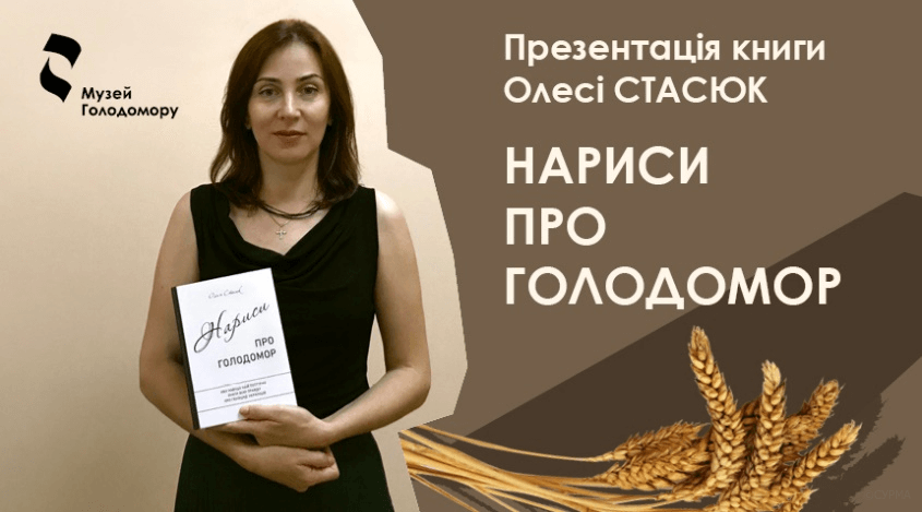 На фото: Леся Стасюк з книгою «Нариси про голодомор»