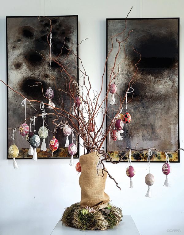 Дерево з писанками на тлі робіт Оксани Корнелюк в її ательє