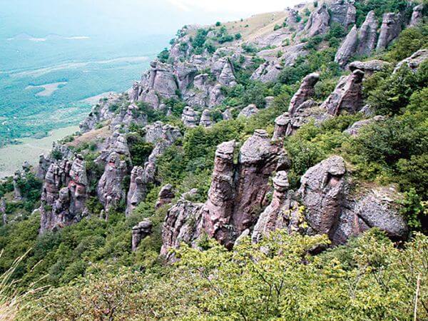 До нас звернений схил гори Демерджі, вкритий химерними кам’яними скульптурами, витворами багатомільйонрічного процесу вивітрювання вулканічних порід. Будь-яка людина хоча б з мінімальною фантазією знайде чим її зайняти. Ось вежі якогось дивовижного замку, а тут видніються ледь не дорійські колони, ще далі бурхлива фантазія підказує обриси якихось відомих чи фантастичних людей і тварин. Природа тут добре попрацювала своїм різцем скульптора.