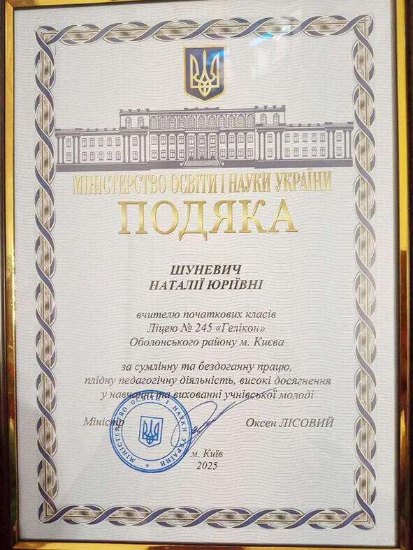 У першу неділю жовтня в Україні та світі традиційно відзначають День учителя – свято людей, які щодня творять майбутнє країни, виховуючи та навчаючи нові покоління. Ця професія вимагає не лише знань, а й терпіння, натхнення, любові до дітей та справжнього покликання. Саме такою є Наталія Шуневич – вчителька початкових класів із понад тридцятирічним стажем, вчитель-методист ліцею №245 «Гелікон» у Києві. Вона пройшла шлях від дитячої мрії до власних авторських програм, виховала не одне покоління школярів і вважає читання основою виховання. Напередодні професійного свята ми поспілкувалися з пані Наталією про її шлях, виклики воєнного часу, сучасну українську освіту та секрети любові дітей до книжки.