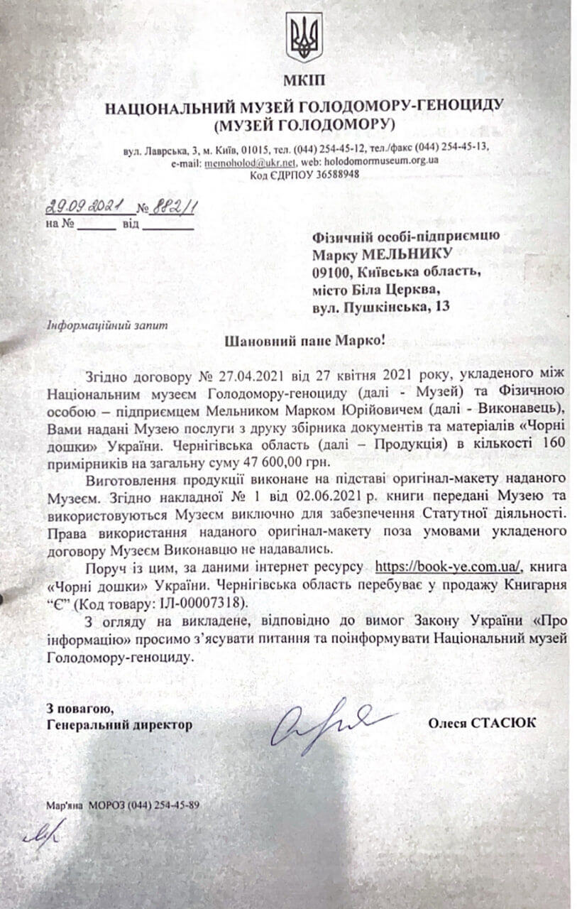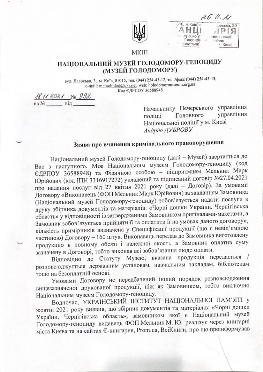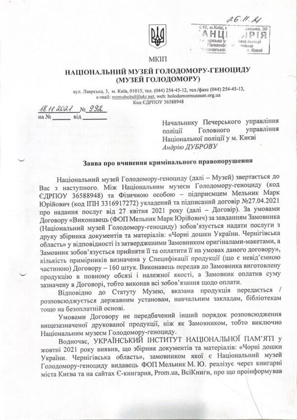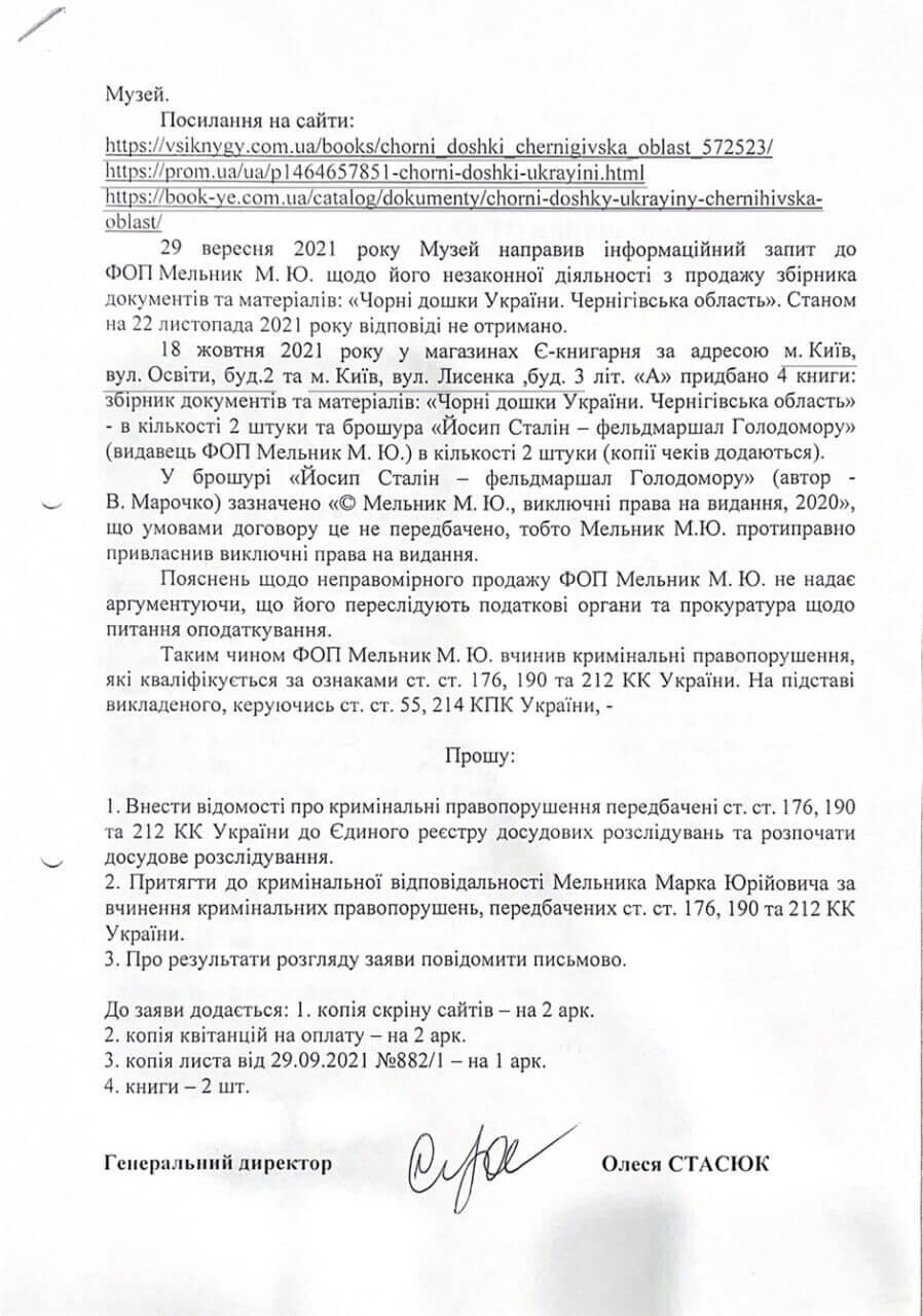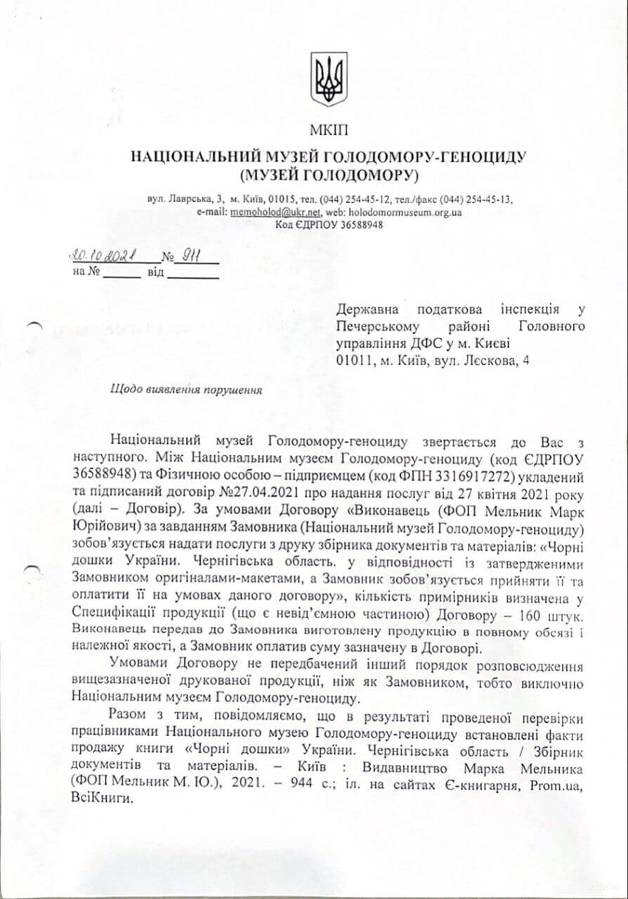 20 жовтня 2021 року Національний музей Голодомору-геноциду звернувся до Державної податкової інспекції із заявою про виявлення порушень у діях ФОП Мельник М.Ю. У документі – посилання на інтернет-сторінки книгарень, де продавалися книги, замовлені Музеєм.