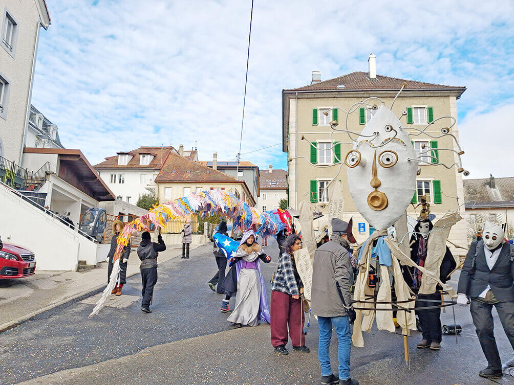 Або у Ґрансоні, біля замку, біля озера, підтримуються середньовічні традиції. Водночас на вуличках зі старовинною архітектурою помітна сучасність. Ми бачимо великі машини і багатьох дітей у костюмах, учасники розкидають конфетті. А в Івердоні-ле-Бен щороку – по-різному. Одного року це концерт біля собору, а музиканти – у костюмах і масках чорних баранів, дмуть у духові інструменти (золочені сурми, гелікони…), і, хоча до цих золоторогих баранів можна поставитися з гумором, насправді все дуже серйозно. У ході беруть участь різні організації, зокрема школи, а також земляцтва, національні об’єднання – від корінних швейцарців до інших народів, як-от македонців. Учасники виступають із прапорами та, звичайно, у національних костюмах. Наприклад, барви кантону де Во – зелена і біла. А у процесії несуть –велику рухливу іграшку? Ні, це не іграшка, а художньо виконане зображення дракона. Вочевидь, саме його потім урочисто сплять, коли стемніє.