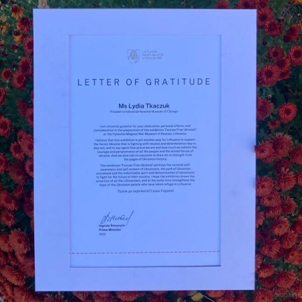 Приємно повідомити нашу громаду у Чикаго, що саме з рук прем’єр-міністра Литовської Республіки Інгріди Шимоніте пані Ткачук отримала почесну грамоту подяки за участь музею у виставці, яка упродовж цілого року триматиме увагу литовців та гостей музею на українській боротьбі, на прагненні якнайшвидше здобути перемогу над російськими окупантами. «Разом до перемоги! Слава Україні!» – під такими гаслами проходила уся церемонія відкриття, у найкращих традиціях литовської військової історичної спадщини.