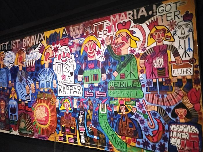 Повернуся до музею в Лозанні. Тут — численні полотна, малюнки, тканини, навіть меблі чи інші плетені конструкції, схожі на пагоди. Дерев’яні статуетки, гігантські ляльки (схожі на ідолів чи божества), інші предмети (схожі на ритуальні). І ще багато всього. Різні техніки. Проте — жодного хаосу. Навпаки: експонати систематизовані, оздоблені інформацією про авторів і стиль (є навіть каталог та інша література, яку можна вільно гортати, умостившись на лавці). Ознайомившись з творами одного митця, плинно переходимо до наступного.