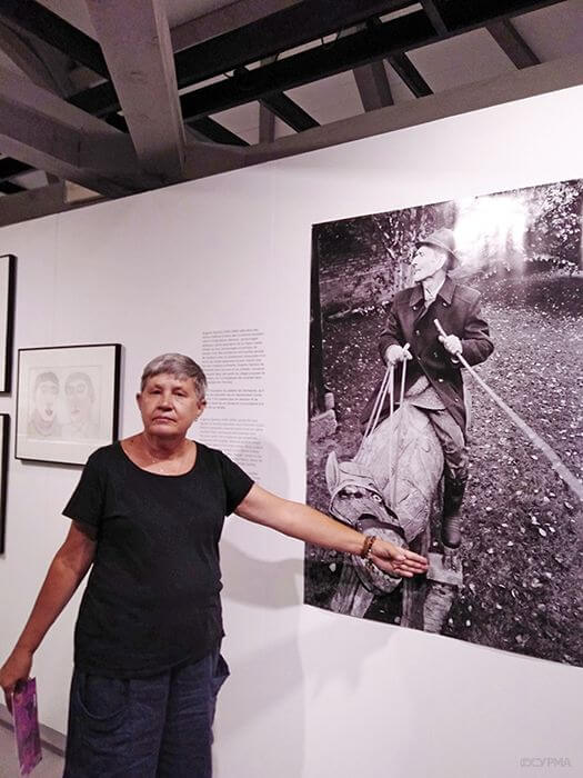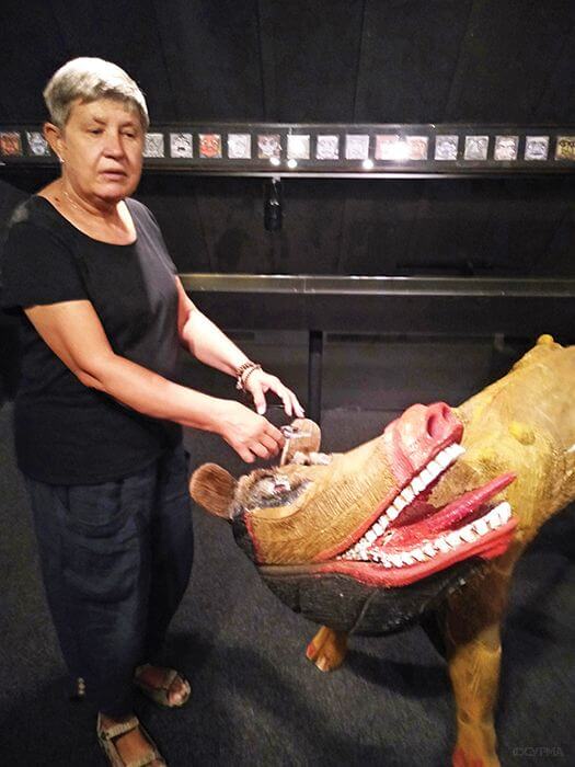 Окремо відзначу оформлення виставки. Наприклад, біля дерев’яних скульптур, які нагадують і тварин, і людей — величезне фото митця з інформацією про нього. Але це ще не все: на чорно-білій світлині усміхнений італієць Санторо їде на запряженій дерев’яній свині (навдивовижу подібній до живої). Своєму шедеврі. Він керує віжками. А його нога в чоботі «взута» в ратицю свині. Символічно. А також фото показує, що така свиня — винахід, «автомобіль».