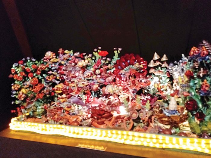 Дуже багато блискучого матеріалу, зокрема пацьорок. Є інсталяції, схожі на підводний світ із його багатствами (коралами, перлами тощо). Є моделі, схожі на фантастичних динозаврів. Є малюнки, що нагадують фантазією звірів Марії Приймаченко. Експонатів стільки, що їх не виставляють за один раз, а чергують експозиції.