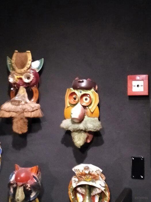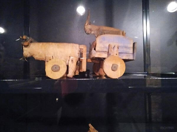 Є милі дерев’яні іграшки, схожі на народні. Наприклад, пара волів тягне візок. Є бичок (чи інша тварина?), чия морда оббита шкірою. Вираз схожий на людський! Або волики везуть у візку іншу тварину — цапа (?). Отже, це непрості забавки. А є керамічні скульптури, схожі на наші іграшки — проте це якісь гібридні тварини, схожі на ідолів. Також дуже цікаві зірки, що нагадують наші різдвяні (так, із якими колядують).