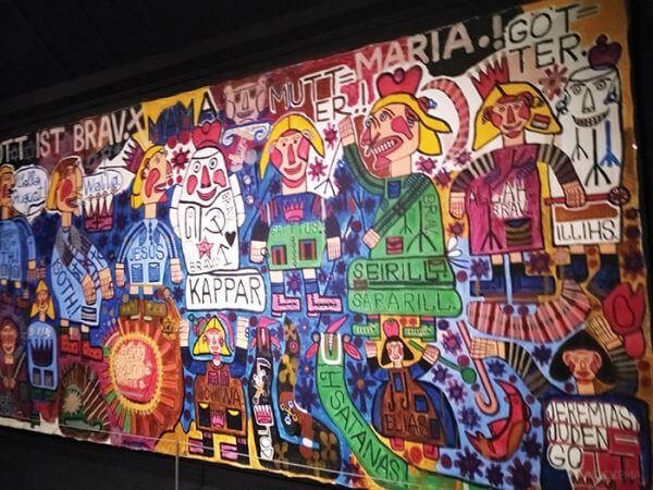 А витинанки? А картини Марії Приймаченко? На швейцарській виставці були витвори, схожі за принципом на це наївне мистецтво, де оживають фантастичні звірі та птахи, де несподівані контрастні барви, і самі картини — ніби реальність, змішана зі сновидіннями. Чи інша реальність. Хоча ар-брют протиставляють наївному мистецтву (але в деяких джерелах — навпаки, порівнюють із наївом), усе одно: я бачила прекрасні картини, схожі на видіння та попередження Марії Приймаченко.