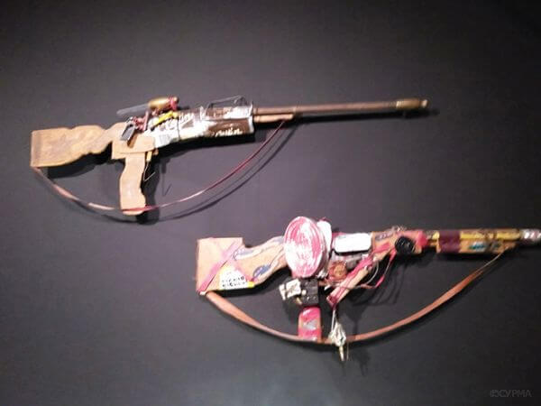 Наголошу на антимілітарному характері цього музею та його виставок. Як писала, тут і тема Спротиву, й антигуманності війни, і боротьби зі злом (що помітно в біографіях митців). Є статуетки і картини, які зашифровують художній протест. Є зброя — рушниці, оздоблені в декоративному стилі, і вже з однієї деталі стає зрозуміло: митець — проти війни. Автор — Андре Робійяр (André Robillard, народився 1931 р.), родом із Франції, Орлеан. Концепція його робіт: мистецтво треба обороняти, але насильство — проти самої природи.