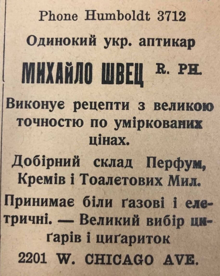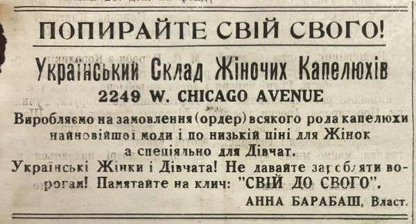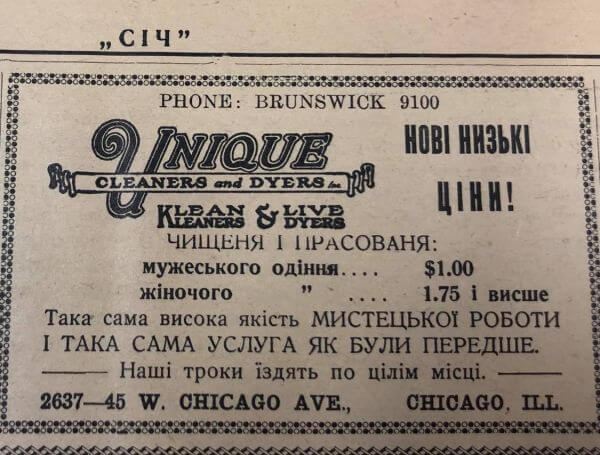 «Поважні Громадяне! Отим маємо честь повідомити вам, що при 2502 В. Шикаго Евню провадимо кравецький шап, де на горі працює 50 людей, а на долі находиться склад. Робимо убраня на замовленя! ...маємо на складі найбільший вибір семплів, позаяк ми сконцентровані з чотирма фабриками сукна. У нас кожний найде свій смак і задовольнить себе. Хто замовить у нас убраннє, отримає одну пару сподень зовсім даром, без різниці який дорогий сут купує. Даром штани будемо роздавати через місяць квітень, тому спішіться з замовленням» (газета «Січ», Чикаго, 1922).
