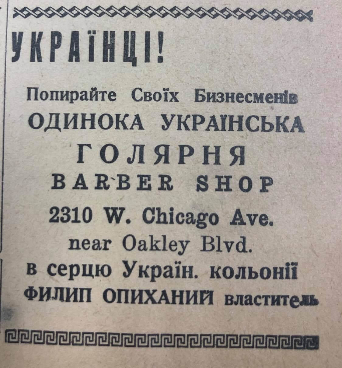 Уміння гарно вдягатися і з користю для себе провести час – це мистецтво, яке притаманне українцям Чикаго. Емігранти вчилися жити з шиком, докладаючи для цього багато зусиль. Через світлини і газетні оголошення розкривається характер громади, її зовнішність, манера провадити бізнес, американізуватися в побуті та навіть одягатися. Частенько ці, на перший погляд, дрібниці спонукають подивитися іншими очима в дзеркало наших попередників. Їм було далеко непросто, але вони довели собі й Америці, що мелодійний акцент при розмові з працедавцем підкреслював їхню унікальність. У прізвищі та імені закодовано ідентифікаційний знак. Ним позначено рід діяльності предків. Кравець, Коваль, Кухаренко жили у доброму сусідстві з Тейлорами, Смітами, Куками, разом працювали, будували кар’єру у сфері торгівлі та побуту. Сьогодні наша мандрівка проляже вулицями Чикаго, де «ремісничі цехи» освоювалися українцями на початку ХХ століття.