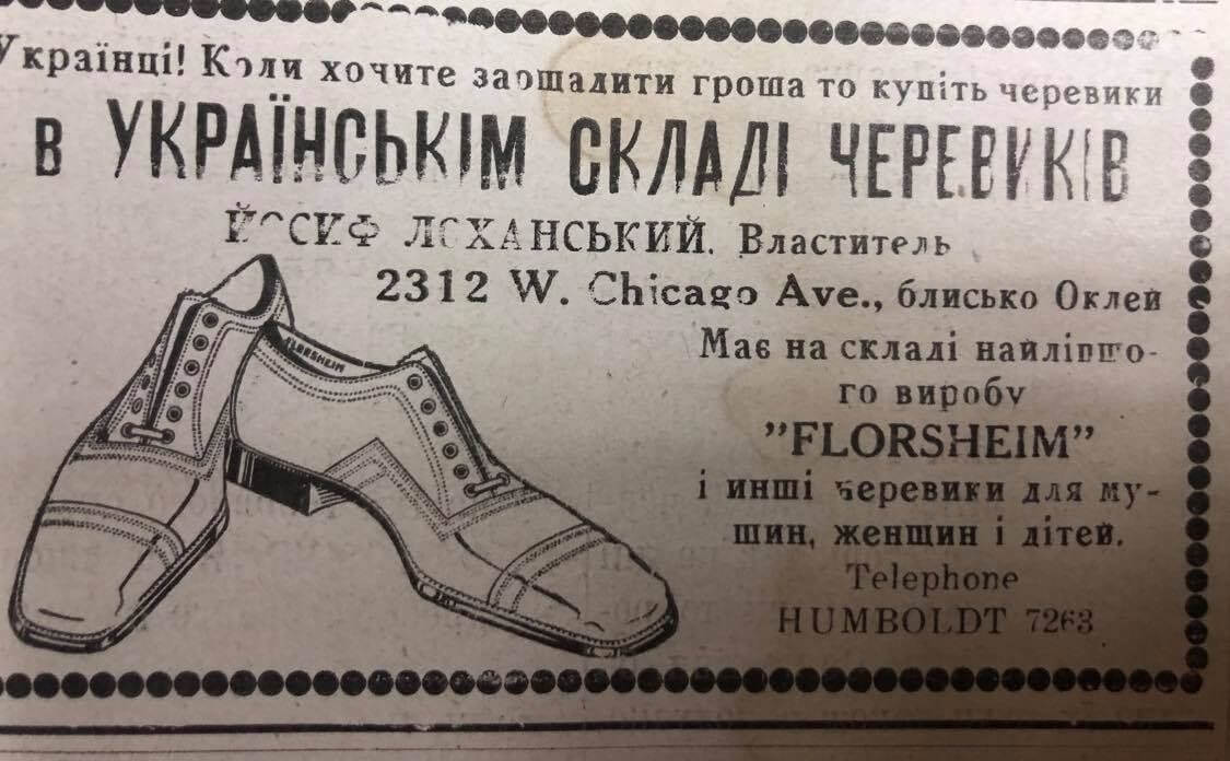Як тиснуть нові мешти, перевзуйтеся в кросівки! Зупинимося, щоб надибати щось недороге, «за поміркованими цінами» на «українськім складі черевиків» Йосифа Лоханського за адресою 2320 Вест Чикаго ав. Під «черевиками» розуміється різноманітне взуття – для дорослих і малих. Розташовувався цей склад поруч із кінотеатром «Оклей», який, на жаль, згорів у 50-му, забравши із собою життя власника складу. Бізнесмен працював сам, щодня від часу відкриття – 1925 рік, аж до останнього дня – 25 років. Продажем взуття займалися Антін Кохановський та пан Сенчук. Хоч кращими крамницями володіли сусіди – німці та італійці, які дотепер залишили за собою марку продавати якісне і зручне взуття, українці підтримували своїх!!!